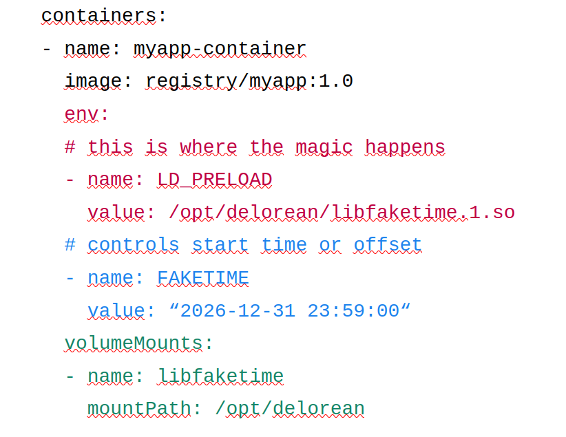 All that’s needed to be done is to inject the library by using an init container and add two environment variables to control the time inside the container.